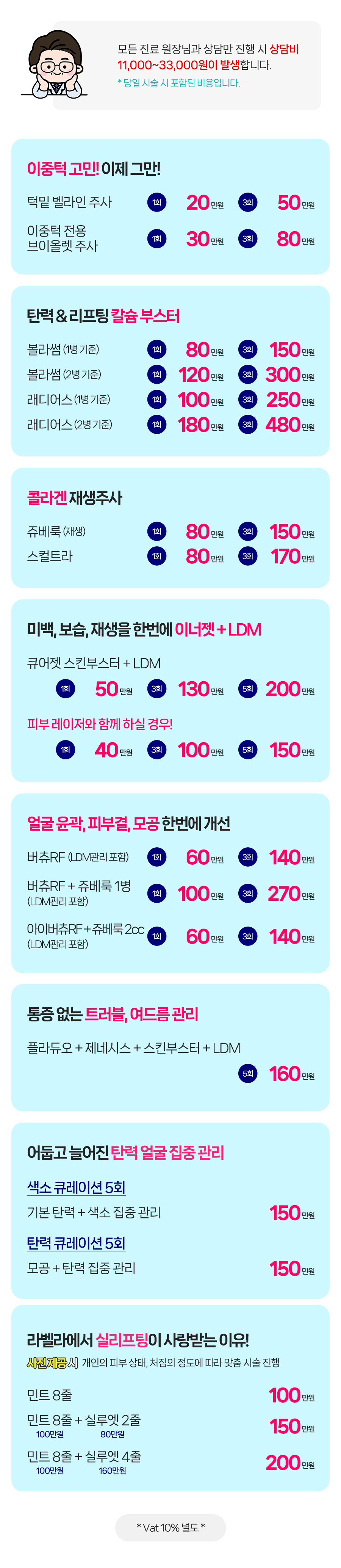 제목라벨라 시술 비용 안내(보톡스, 필러, 문신제거, 흉터치료 등)2021-04-01 16:36카테고리한눈에 보기작성자admin 첨부파일비용안내(섬네일).jpg (33.3KB) 목록 이전12월 이벤트 소식admin 2024-11-01다음12월 진료일정 안내(12/10, 12/17 12/25 휴진)admin 2025-09-25 Powered by MangBoard | 망보드 스토어