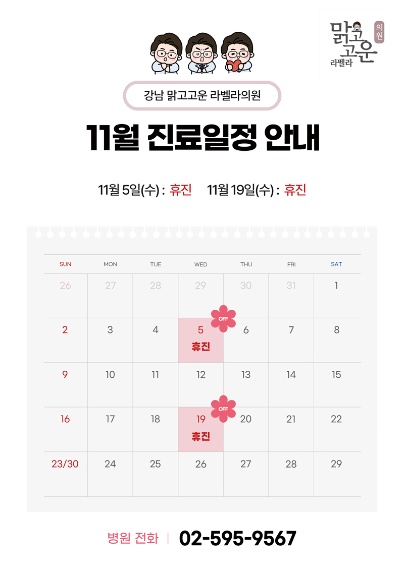 제목11월 진료일정 안내(11/5, 11/19 휴진)2025-09-25 14:08작성자admin 첨부파일11월진료안내(공지사항).jpg (33.9KB) 목록 이전라벨라 시술 비용 안내(보톡스, 필러, 문신제거, 흉터치료 등)admin 2021-04-01다음토요일 진료시간 변경안내(8/1부터 적용 예정)admin 2025-05-19 Powered by MangBoard | 망보드 스토어