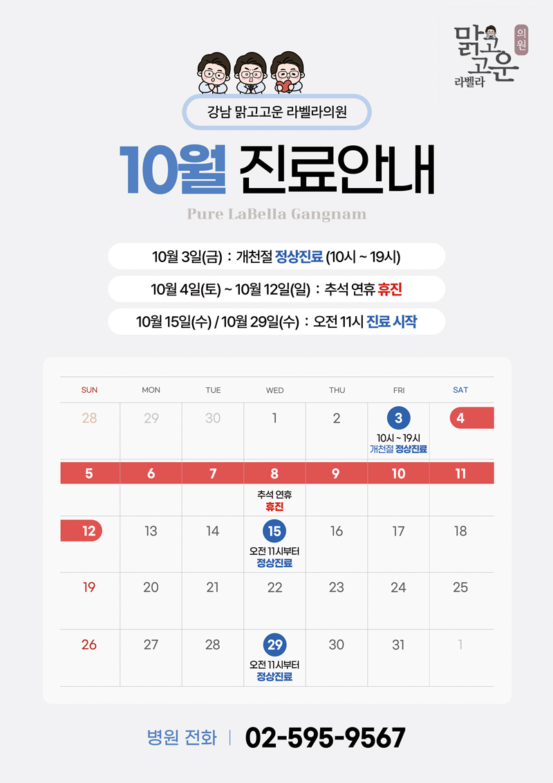 제목10월 진료일정 안내(10/4~12 추석 연휴 기간 휴진)2025-09-25 14:08작성자admin 첨부파일10월진료안내(공지사항).jpg (38.5KB) 목록 이전라벨라 시술 비용 안내(보톡스, 필러, 문신제거, 흉터치료 등)admin 2021-04-01다음토요일 진료시간 변경안내(8/1부터 적용 예정)admin 2025-05-19 Powered by MangBoard | 망보드 스토어