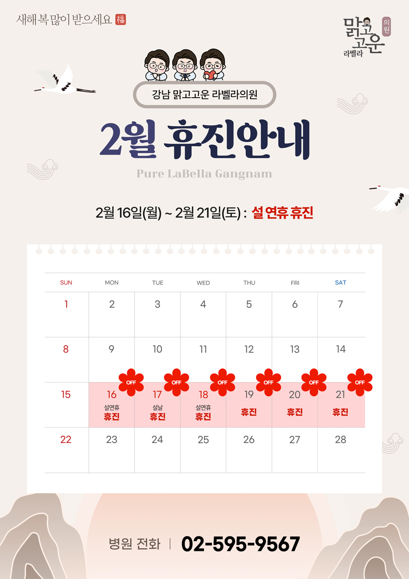 제목2월 진료일정 안내(2/16~2/21 휴진)2025-09-25 14:08작성자admin 첨부파일1월진료안내(공지사항).jpg (34.3KB) 목록 이전라벨라 시술 비용 안내(보톡스, 필러, 문신제거, 흉터치료 등)admin 2021-04-01다음토요일 진료시간 변경안내(8/1부터 적용 예정)admin 2025-05-19 Powered by MangBoard | 망보드 스토어